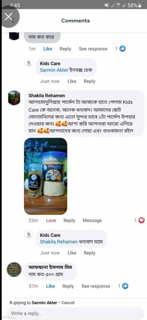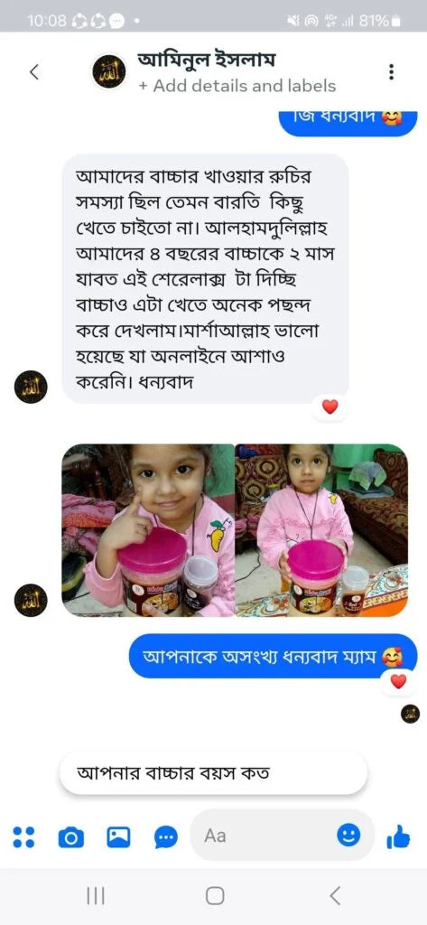 আমি আমার নিজের বাচ্চাকে রেগুলার খাওয়াই,একদম কিছু খাইতে চাইতো না,বয়স হিসেবে ওজনও অনেক কম ছিল,কারণ আমার বাচ্চা ১৬০০ গ্রাম ওজন নিজে (প্রিম্যাচুয়েড) দুনিয়ায় এসেছিল, ইনশাআল্লাহ এখন সব ঠিক আছে, শুকরিয়া,কারণ এটা পুষ্টিবিদের পরামর্শে ঘরোয়া ভাবে বাসায় বানাই,কোন উপাদান বিন্দু পরিমান কম দেই না, যদিও খরচ অনেক বেশি হয় অন্যদের তুলনায়,তার পরও আমি চাই আপনারা যে আশা করে প্রিয় সোনামনির জন্য কিনেন,মহান আল্লাহ যেন সে আশা পূরণ করে,যদি খারাপ ফুড দিয়ে উপকার না পান বা কোন সমস্যা হয়, অবশ্যই পরকালে জবাব দিতে হবে,প্রথমবার এইটুকু বিশ্বাস করে টেষ্ট করাতে পারেন,ভালো মনে হলে নিয়মিত নিবেন আশা করি,একবার খাওয়ালে ফলাফন ইনশাআল্লাহ নিজে অনুমান করতে পারবেন,আমি যেহেতু উপকৃত হচ্ছি বা কোন সমস্যা এখন পর্যন্ত হয়নি তাছাড়া আমাদের সেরেলাক ল্যাব টেষ্টকৃত, নিশ্চিন্তে থাকেন কোন প্রকার সমস্যা হবে না, বাচ্চার বিষয়ে আমরা খুবই সেনসিটিভ।