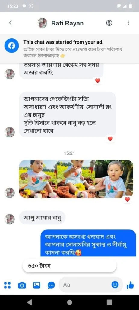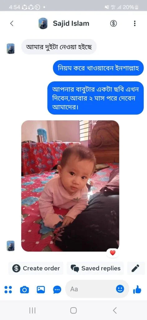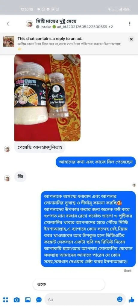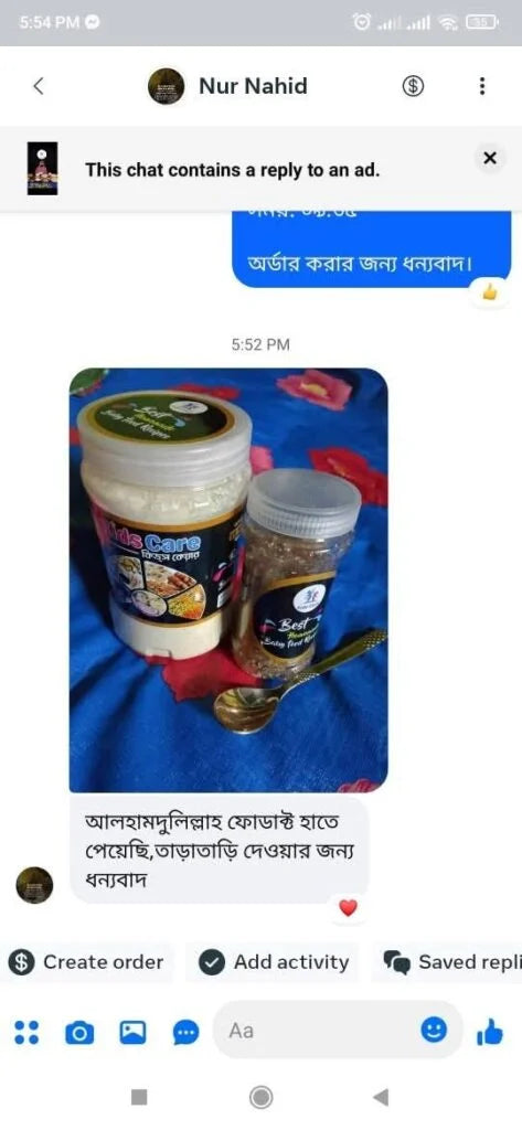 আলহামদুলিল্লাহ, আমার নিজের বাচ্চাও এখনো নিয়মিত এই খাবারই খায়, আর সেই একই খাবার আমরা সারা বাংলাদেশে সর্বোচ্চ যত্ন সহকারে পৌঁছে দিচ্ছি ইনশাআল্লাহ।