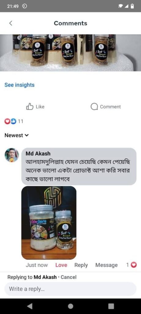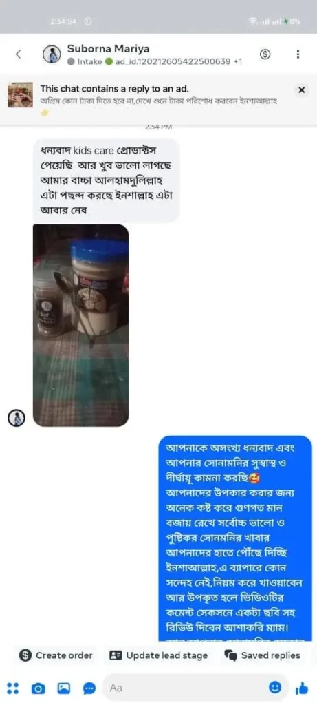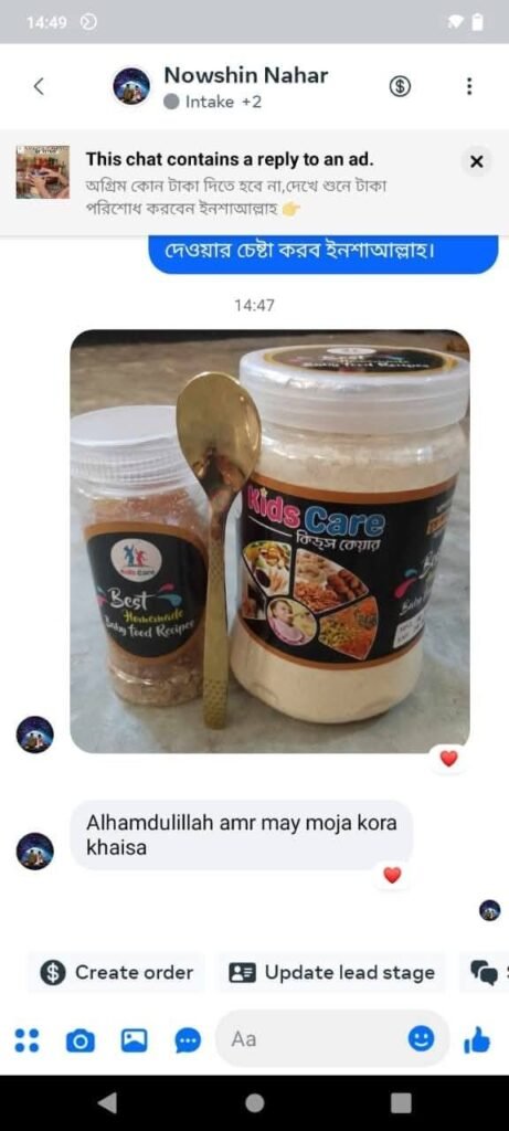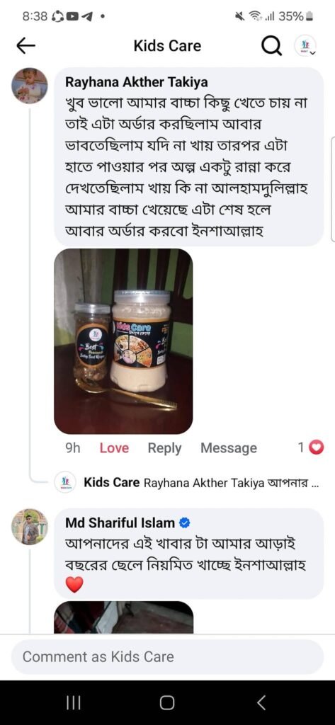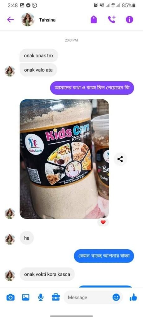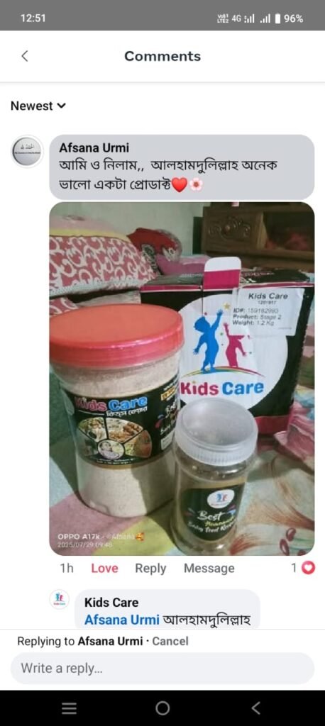 আমরা শুধু খাবার বিক্রি করি না – আমরা আপনার শিশুর সুস্থ ভবিষ্যতের জন্য কাজ করি! হাজারো মা আমাদের বিশ্বাস করেছেন, কারণ তারা দেখেছেন Kids Care -এর বেবি ফুড শিশুর ওজন বাড়ায়, রোগ প্রতিরোধ ক্ষমতা বৃদ্ধি করে, এবং মস্তিষ্কের বিকাশে সহায়ক।